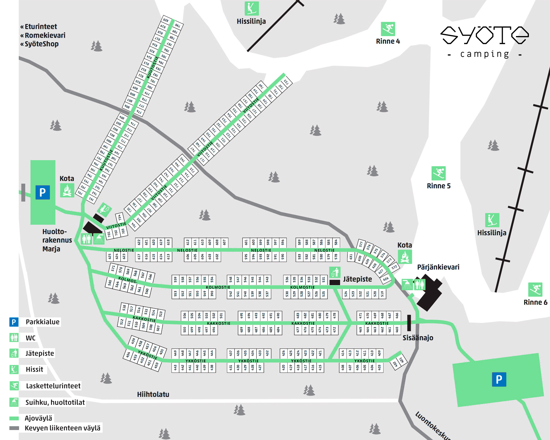 Campingalueen huoltorakennuksesta löytyvät WC, suihkut ja sauna – kaikki kätevästi lähellä.
